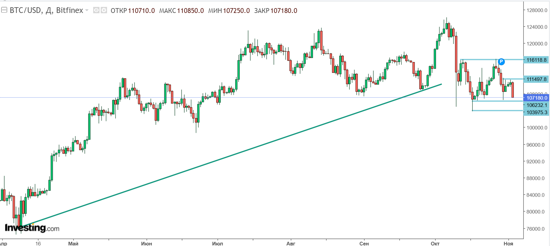 А биткоин впервые за 8 лет в прошлом месяце дал снижение. Тоже смотрит на замедление мягкости Федрезерва, подъём доллара, прошлую перекупленность из-за слишком быстрого роста с конца сентября. Но теперь биткоин упал к нижней границе своего коридора в районе $106200. От этих рубежей вероятно движение вверх по основному тренду, который остаётся восходящим. В таком случае первая цель будет $111500, а при её преодолении – верх диапазона на $116000–116200. Ну, а поддержка ниже $106000 – на рубежах $104000-105000.