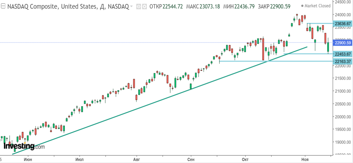 Вот индекс NASDAQ – он уязвим больше, чем S&P500, поскольку «пузырь» опасен в основном в технологическом секторе. Снижение индекса за неделю с 23 600 п. к 22450 п. объяснимо тем самым «неприятным аппетитом». Но пока это коррекция в рамках восходящего тренда. Смена тренда на нисходящий технически произошла бы в случае пробития 22160 п. Сейчас зона поддержки – как раз эти рубежи 22160-22450 п. Хороший знак, что от него уже есть отскок вверх по тренду к 22900 п. Сейчас вероятно движение в этом текущем диапазоне 22160-23640 п., пока не прояснится, сохранится ли «бегство от рисков».
