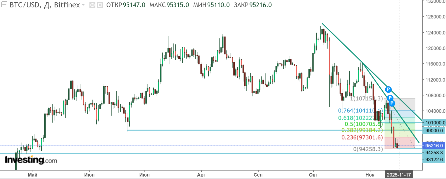 А вот биткоину совсем плохо. После падения на страхе и закрытии позиций крупных держателей у «битка» весь годовой тренд сменился на нисходящий. И прошедшая неделя только подтвердила это. Ослабление надежд на снижение ставки ФРС уводило его ниже $94 000 – к минимуму с мая 2025 года. Потерял всё, что за полгода «нажито непосильным трудом». И теперь рубежи $99000-101000 – сильное сопротивление. Там и экстремумы, и зоны Фибоначчи 38,2% и 50%, и возможное действие трендовых линий, если к ним цена подойдёт на этих рубежах. Так что теперь вероятно отбитие от них вниз в случае подъёма цены. А поддержка – на $93100-94100. Сейчас возможна консолидация в широком диапазоне от $94000 до $99000-100000.