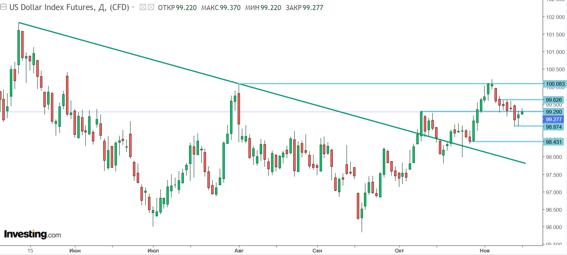 Поэтому ему не удалось в ноябре сломить даунтренд, граница которого – 100 пунктов. Более того. По технике важно, что доллар ушёл в последние дни ниже и текущей поддержки 99,3 п. Правда, и здесь пока ослабление приостановилось, доллар чуть поднялся к 17 ноября. Ведь Дональд Трамп снизил импортные пошлины на некоторые продукты. А то говядина и кофе стали слишком дорогими. А ведь именно крайне высокие тарифы – одна из причин и страхов торможения экономики и давления на доллар. Но пока подход снизу от 98,8 п. к 99,3 п. выглядит как ретест сопротивления снизу. В случае его пробития вверх возможно движение к уровням 99,6 п. Но и это будет только более глубокой коррекцией в даунтренде. А если 99,3 п. выдержит, то подтвердится путь вниз с первыми целями 98,8-98,4 п.