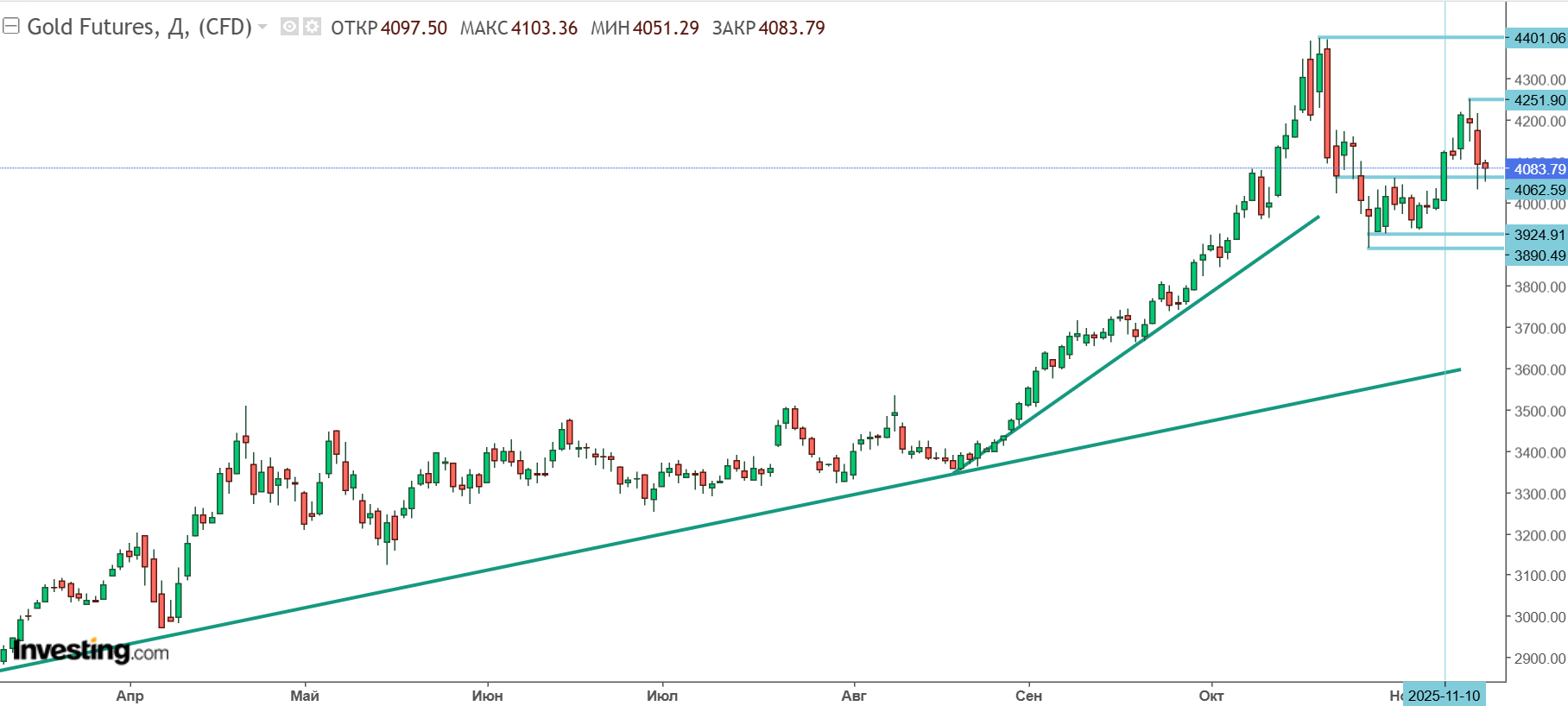 И только золото выигрывает от бегства от рисков. Фонда бежит. Крипта бежит. Доллар бежит. Помните знаменитый фильм? «Динамо» бежит? Все бегут!» Так куда все бегут? В защитные активы. А что может быть «защитнее» золота? Но и здесь есть противоречия. Смотрите: цена 10 ноября на риске выскочила вверх над текущим сопротивлением $4060 и доходила до $4252. И тем самым обозначила новый импульс восходящего тренда. Но в последние дни доллар стал корректироваться вверх, и золото пошло в коррекцию вниз. Сейчас снова опустилось в район $4060-4080, то есть почти к месту прошлого пробития. И это, как и у доллара, ретест, только сверху. Если останется выше $4060, вероятен подъём с целями к $4250. Альтернатива – при закреплении ниже $4060 – уход снова к поддержке $3900-3920. Но тренд всё равно остаётся восходящий, факторы за золото сильны. В среднесрочной перспективе, по мере снижения ставок ФРС, вероятно и $4400-4500, и выше.