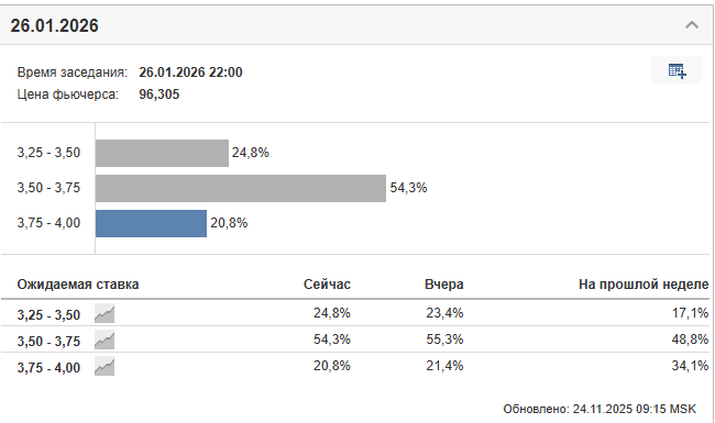 На прошлой неделе резко менялся и взгляд рынка на сохранение ставки 4% в декабре. Вероятность этого поднималась до 62%, хотя две недели назад была только 38%, по фьючерсам на ставку.