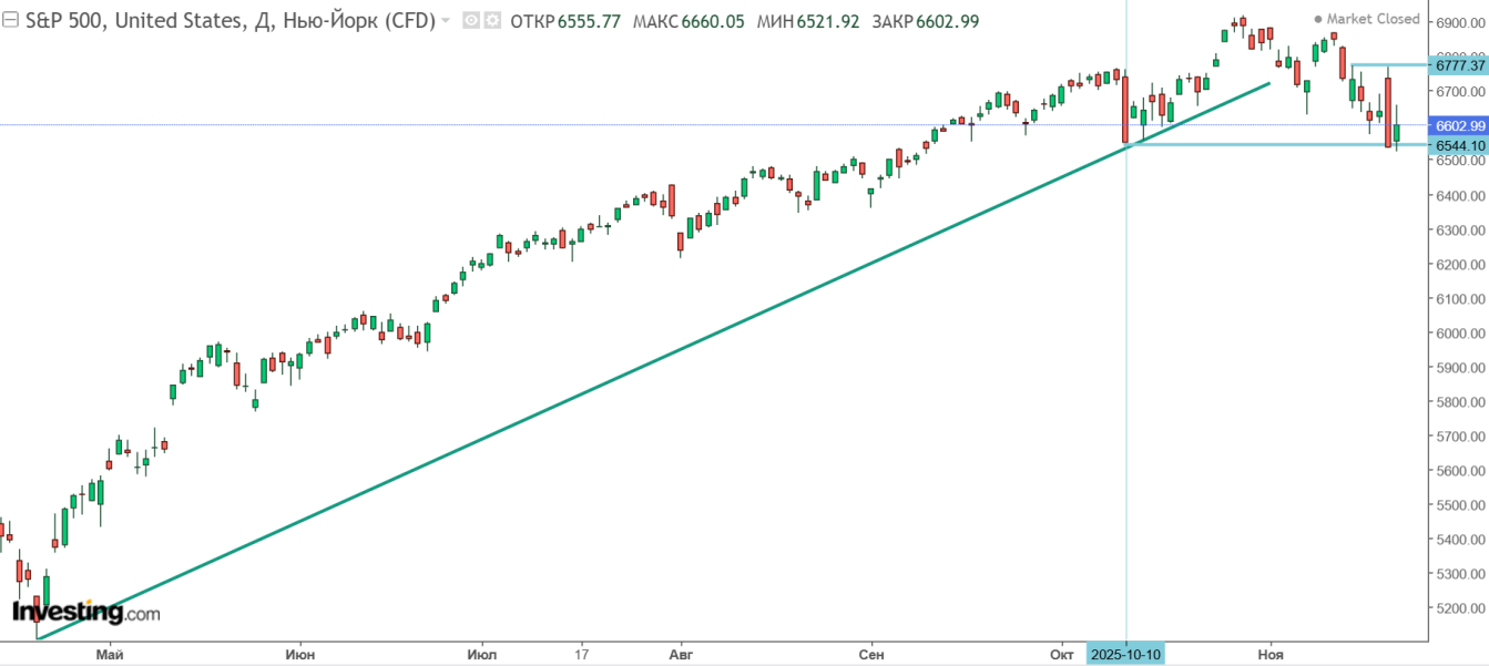 Для индексов акций неделя была негативной. Протоколы ФРС, вероятность сохранения ставки продолжали давить на S&P500. Он снизился с 6800 п. к 6520 п. Остаётся и опасность «пузыря» из-за искусственного интеллекта. Но и здесь поворот на рынке может сыграть свою роль. Идея неснижения ставки отработана. Остановленное из-за шатдауна финансирование может после него усилиться, повысить денежную массу, ликвидность, что позитивно для акций. Кроме того, приближается традиционный предновогодний сезон «ралли Санта Клауса». Так что индексы акций могут ещё расправить крылья.