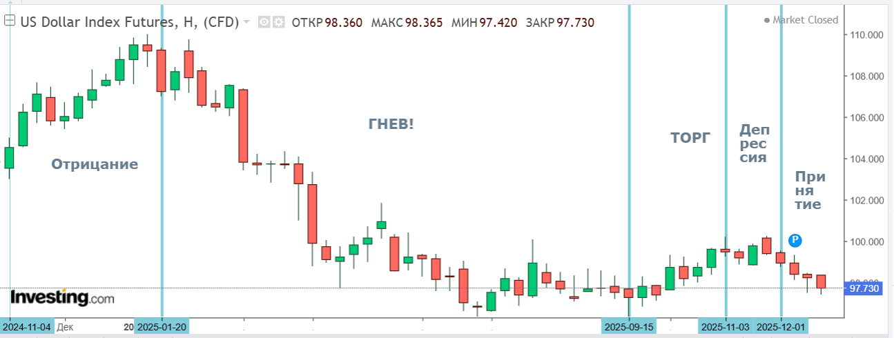 И затем – стадия окончательного Принятия судьбы, безысходности, холода. Это наступление зимы тоже отражено в Finversia. Опасность безработицы, близость отставки Пауэлла, два снижения ставок ФРС до 3,75%, завершение их срезания другими центробанками – вот фон печальных для доллара последних недель года. Уход от 100 п. к 97,4 п.