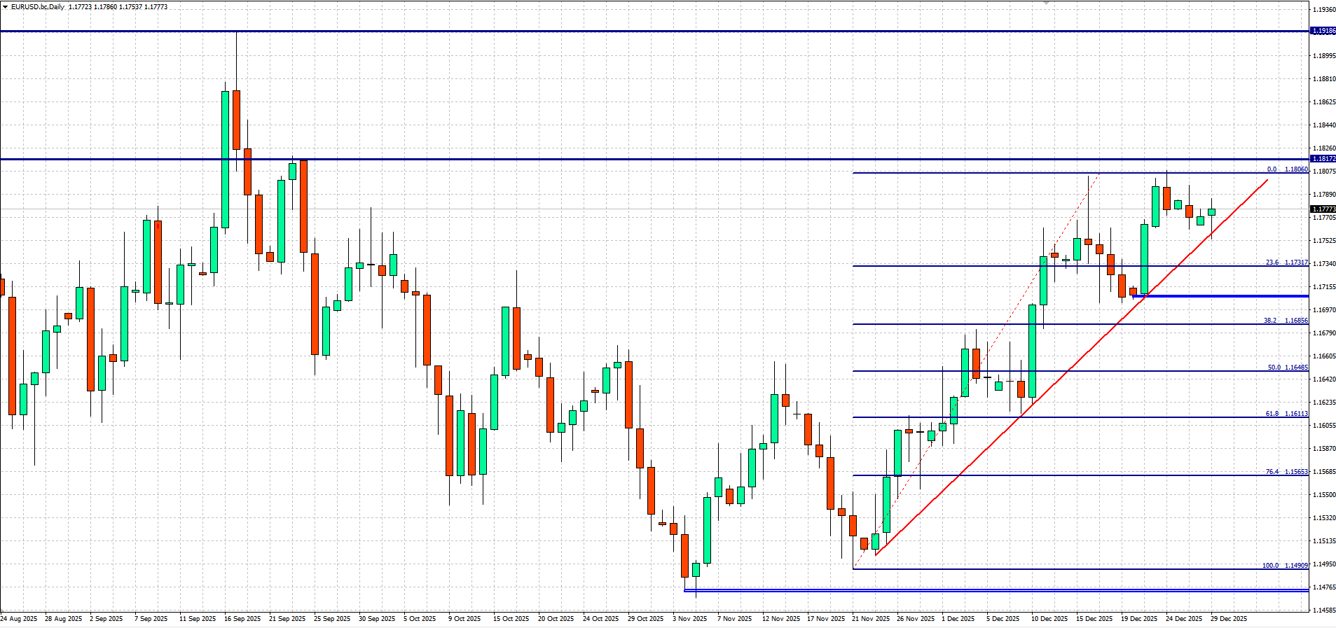 Всё это даёт вероятность ослабления доллара и дальше. Хотя и с меньшей силой, основные движения прошли. Пока остановились над поддержкой 97,4 п. Данные по ВВП показали рост до 4,3% – максимум за 2 года. Ожидание срезания ставки в январе снизилось с 25% до 2%. Пока будет пауза у ставки, возможна консолидация доллара, техническая коррекция вверх. Сопротивление – 98,4 и 98,9 п. А в случае пробития вниз 97,4 п. следующая цель – 97,1 п. Интересно, что покажет протокол последнего заседания ФРС, который публикуется 30 декабря.