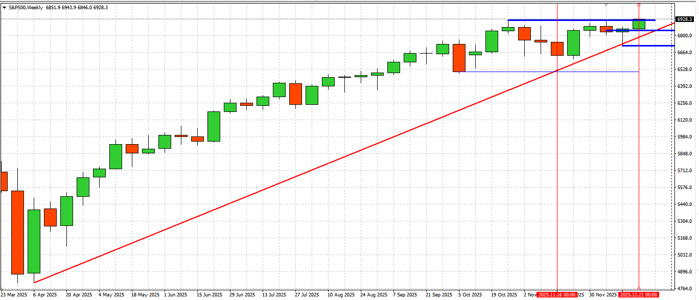 А вот индекс акций S&P500 – один из тех, кто выиграл от несчастной судьбы доллара, снижения ставок. Ралли состоялось, индекс перебил предыдущий исторический рекорд и поднялся к 6945 пунктов. Щедрый оказался Санта-Клаус. Но он только завершает движение года. С апреля, с минимума года индекс вырос от 4800 п. выше 6 900 п., на 43% за 8 месяцев. Важные причины, помимо доллара и ставки – бум искусственного интеллекта. Поутихли разговоры о «пузыре» в нём, которые обрушили индекс в середине ноября.