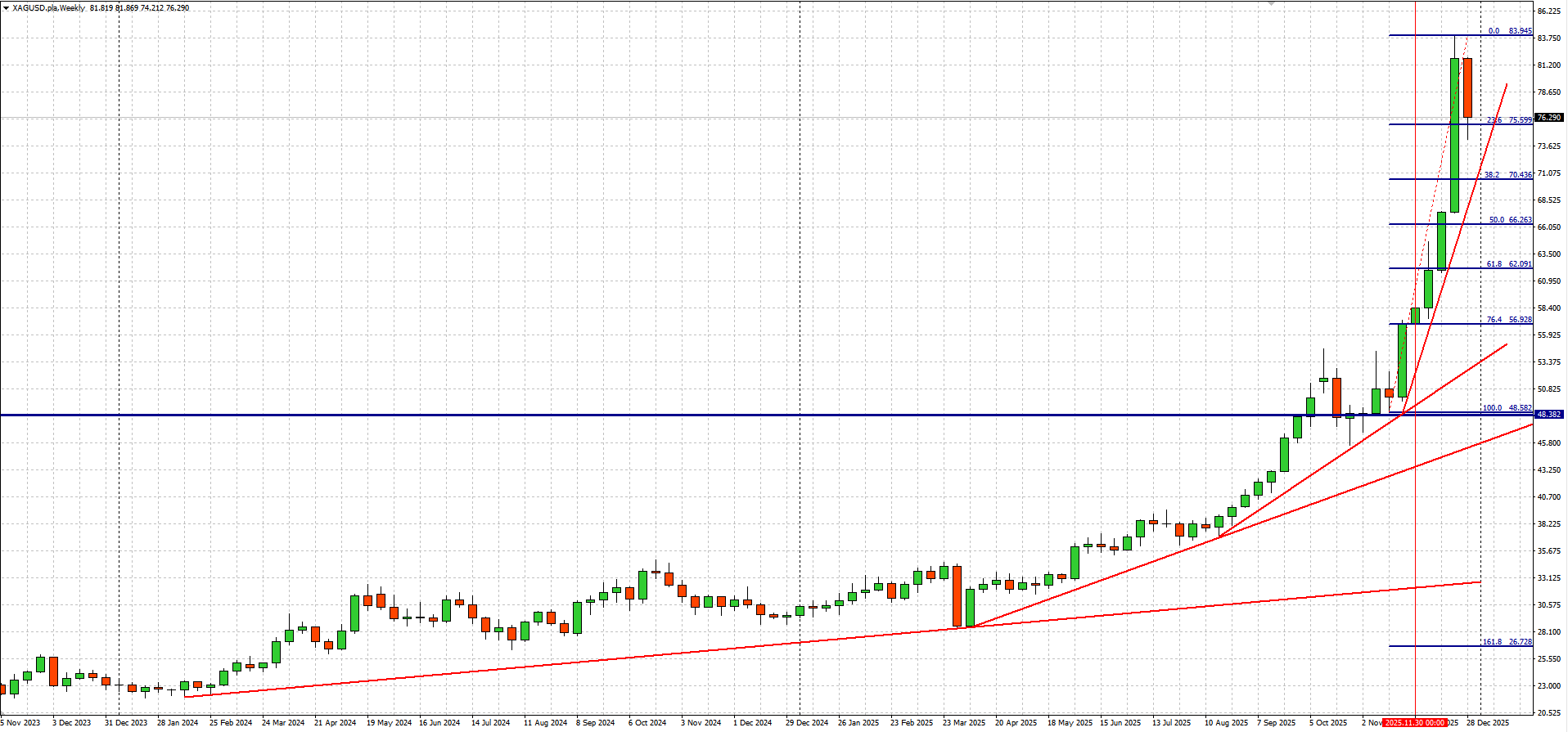 Хотя серебро можно было покупать и в начале декабря. В этом месяце особо сильное движение – на 47% от $56,7 до $83,8 – на $27. Такого не было никогда в истории. Сочетание причин – весомое. То же снижение доллара и ставок, рост спроса на альтернативные более безопасные активы… Но дополнительно и очень большая потребность в серебре для современных технологий – солнечные батареи, электроника, электромобили, дата-центры. И ещё физическая нехватка серебра при таком спросе. Рынок никак не может насытиться им.