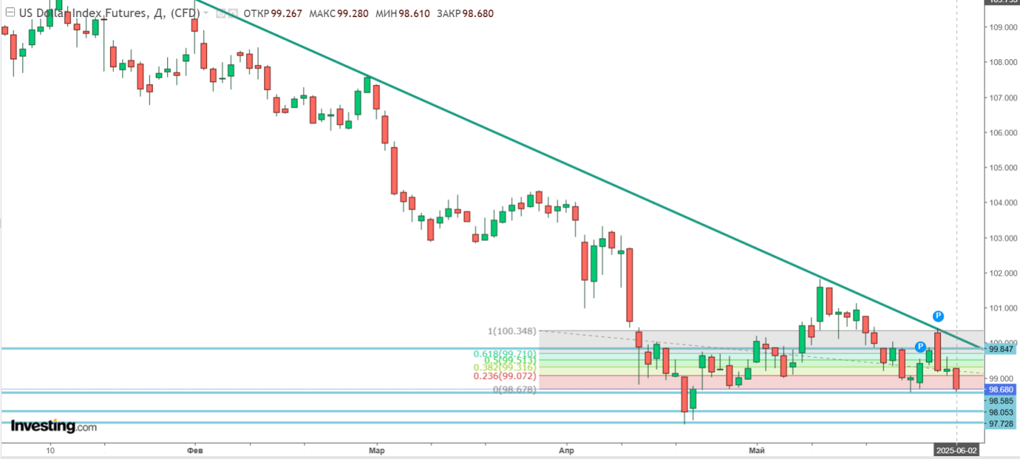 Сейчас USDX подошёл к сильной поддержке 98,6 п. , от которой несколько раз отскакивал в мае вверх. В случае её пробития вниз актуальным станет сдвиг к диапазону 97,7 – 98 п. Но после сильного нисходящего импульса на прошлой неделе возможна коррекция вверх к 99,3-99,7 п., к зонам Фибоначчи. Такое возможно, например, при сильных данных по рынку труда 6 июня или негативе для евро при мягкой риторике заседания ЕЦБ 5 июня.