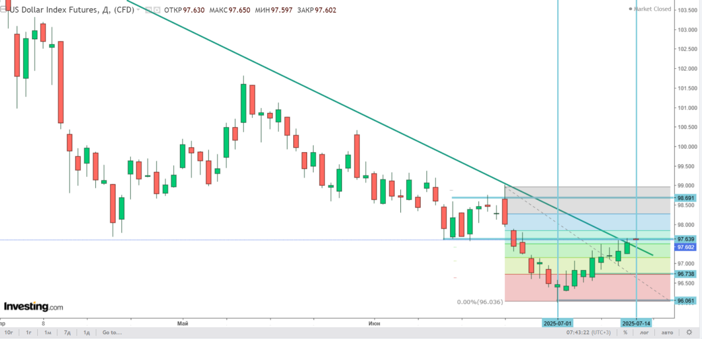 Индекс доллара USDX за прошедшую неделю к 14 июля вырос с 96,6 п. к 97,7 п. Пока реализуется мой прогноз в Finversia 30 июня о его «коррекционном подъёме к уровням сопротивления 97,6-98,1 п.»