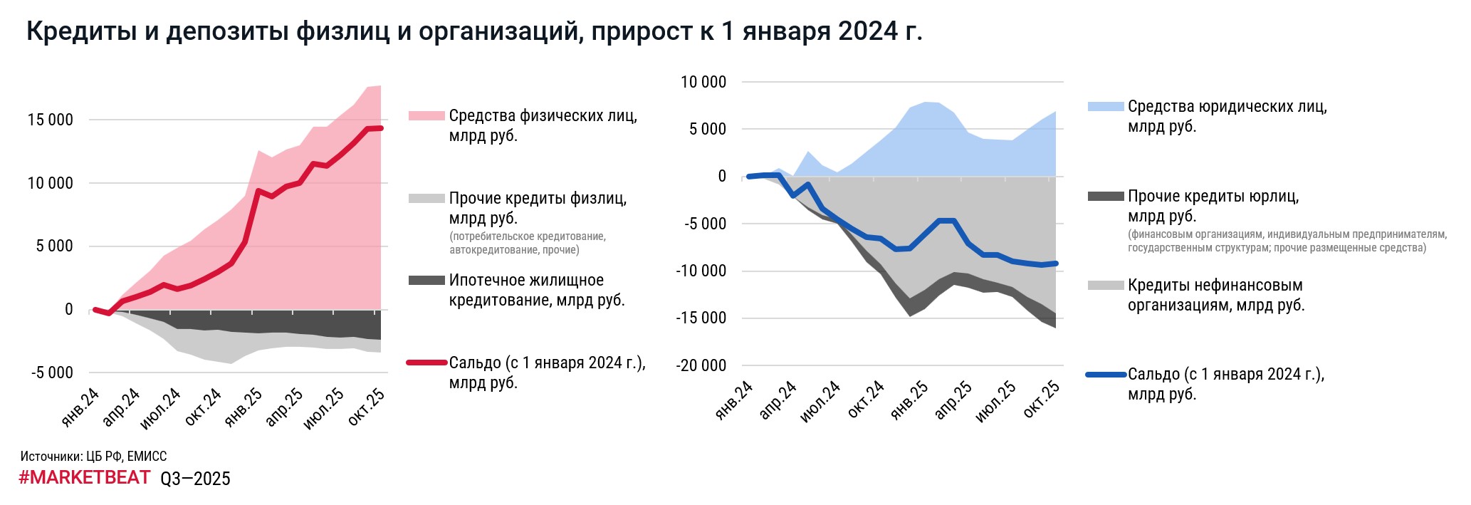 Кредитный канал денежно-кредитной политики в 3-м квартале сохранил стимулирующее воздействие на сберегательную активность населения, несмотря на постепенное снижение ключевой ставки и снижение ставок по депозитам. Активного вывода средств с депозитов пока не происходит. Кредитный импульс в целом снижается, при этом темпы прироста кредитного портфеля и суммы средств на депозитах к сентябрю 2025 года сравнялись как у физических, так и у юридических лиц.