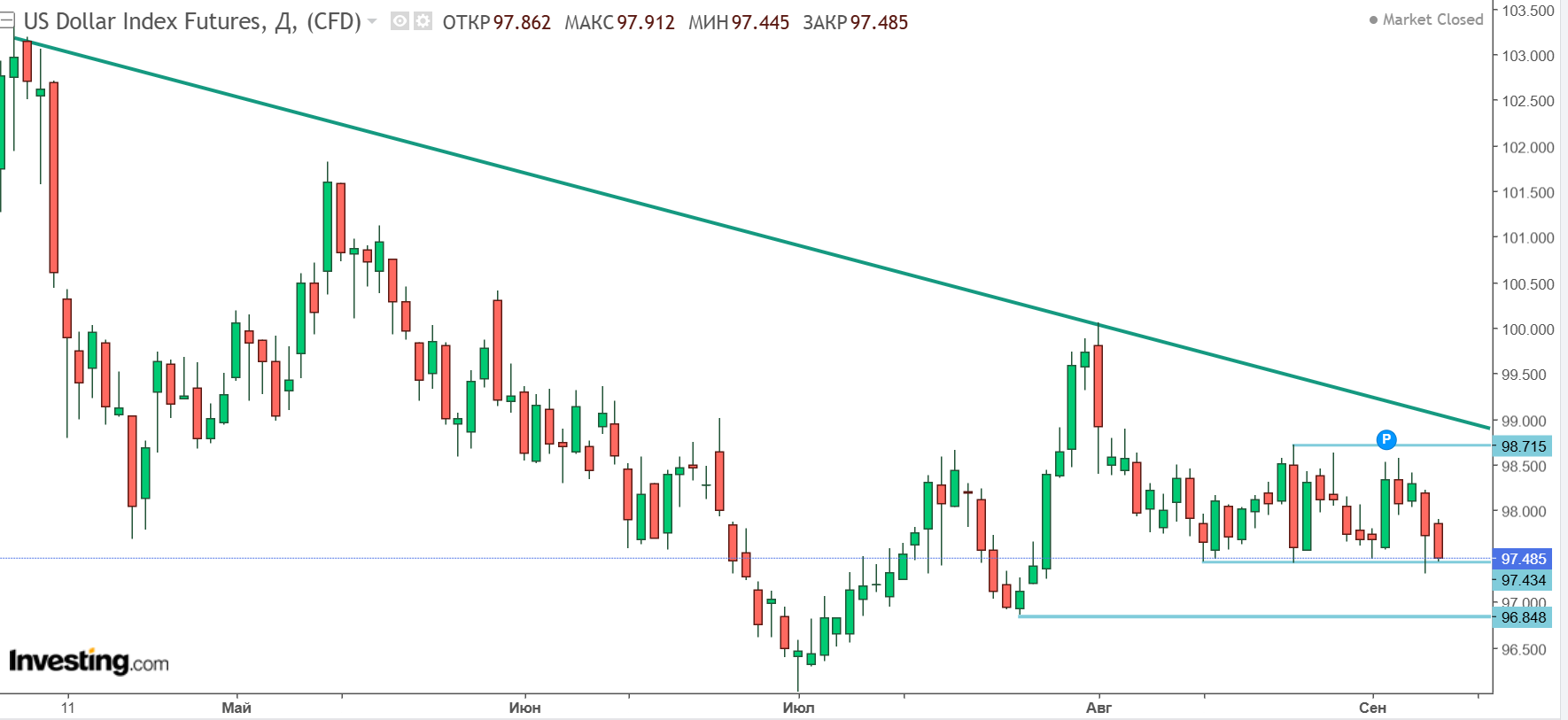 Вот индекс доллара USDX. Его ослабление логично в ожидании смягчения Федрезерва. Однако, он пока не ушёл ниже прошлой поддержки 97,4–97,5 п. Про неё я писал в предыдущей статье в Finversia. При всей нетерпимости к доллару рынки помнят и об осторожности по другим валютам. Долговые и политические пертурбации у Лондона, Берлина, Парижа, Токио сдерживают спрос на альтернативные валюты.
