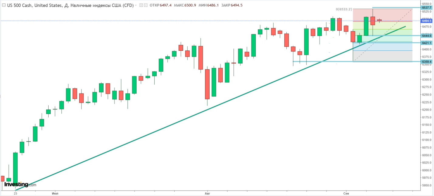 Но затем индекс отошёл от верха, поскольку слабые данные по занятости – риски для экономики. И его тоже не стоит покупать сейчас. Вероятна коррекция. Поддержки – на уровнях 6445, 6420, 6360 пунктов. Там сильные экстремумы и уровни коррекции по Фибоначчи 50, 61,8,100%.