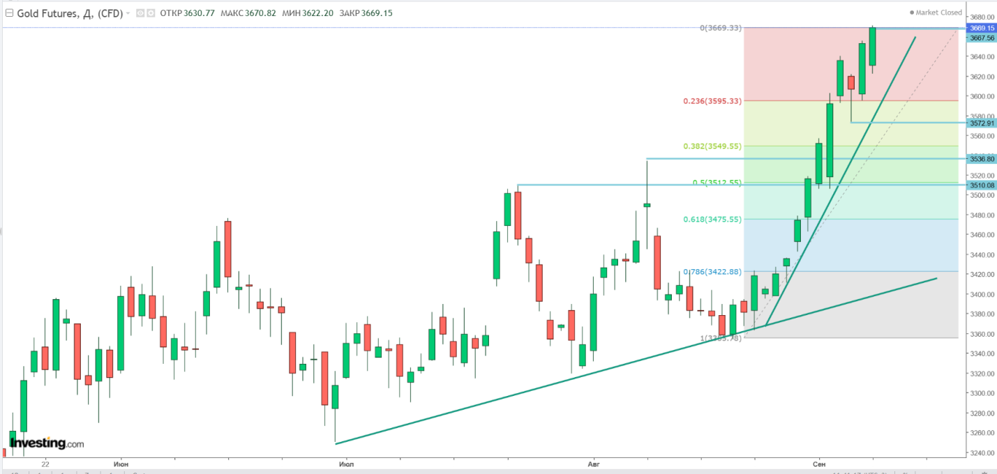 Неудивительно поэтому его ежедневное обновление исторических максимумов в последние дни. Уже подходит к $3670! Но и здесь увлекаться не стоит. Тут как в анекдоте: чем выше забираешься, тем больше дух захватывает! Покупать на хаях сейчас не надо, при всём уважении к благородному металлу. Да, факторы его дальнейшего среднесрочного подъёма сильны, ориентир $3800. Однако тренда без коррекции не бывает. И после перебития максимумов, при текущей отработке указанных факторов, во многом учтённых в ценах, есть вероятность отхода вниз. С технических позиций, уровни поддержки – $3510-3573. В случае подхода к ним рассмотрим покупки по основному тренду.