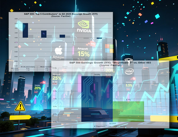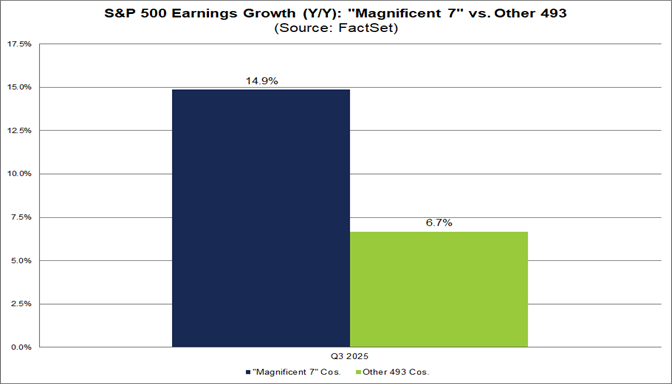 Ожидается, что в совокупности «Великолепная семёрка» компаний продемонстрирует рост прибыли в годовом исчислении на 14,9% в 3-м квартале. Без учёта этих семи компаний совокупный темп роста прибыли оставшихся 493 компаний из индекса S&P500 в 3-м квартале 2025 года составит 6,7%.
