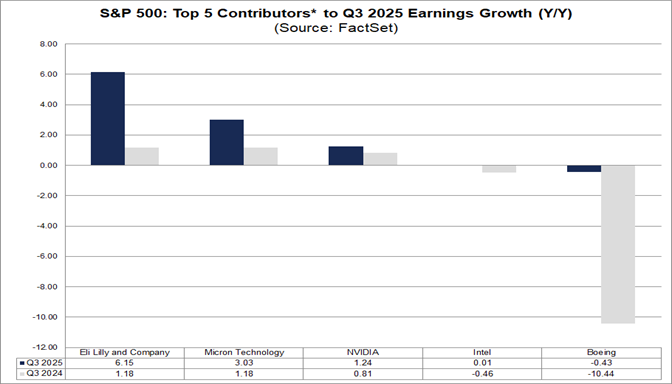 Совокупный темп роста прибыли компаний, входящих в индекс S&P500 в 3-м квартале 2025 года составил 8,5%. Пятью компаниями, которые внесли наибольший вклад в рост прибыли S&P500 в годовом исчислении в 3-м квартале (в порядке убывания), являются Nvidia, Boeing, Eli Lilly, Intel и Micron Technology. Таким образом, только одна из пяти компаний, внесших наибольший вклад в рост прибыли индекса в третьем квартале по сравнению с прошлым годом, входит в «Великолепную семёрку». Между тем, высокие темпы Boeing и Intel связаны с эффектом низкой базы – год назад эти компании показали убытки.