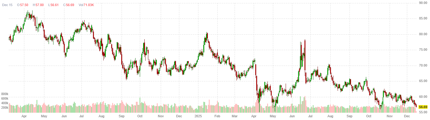 В понедельник цены на нефть снизились более чем на 1%, поскольку участники рынка сопоставляют перебои в поставках, вызванные обострением американо‑венесуэльских отношений, с опасениями переизбытка предложения и возможным мирным соглашением между Россией и Украиной.