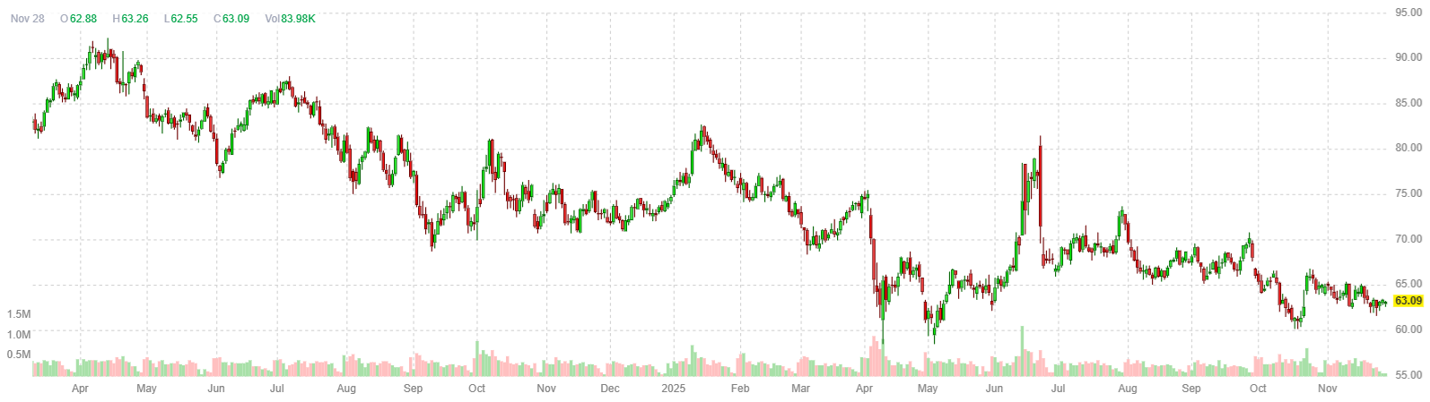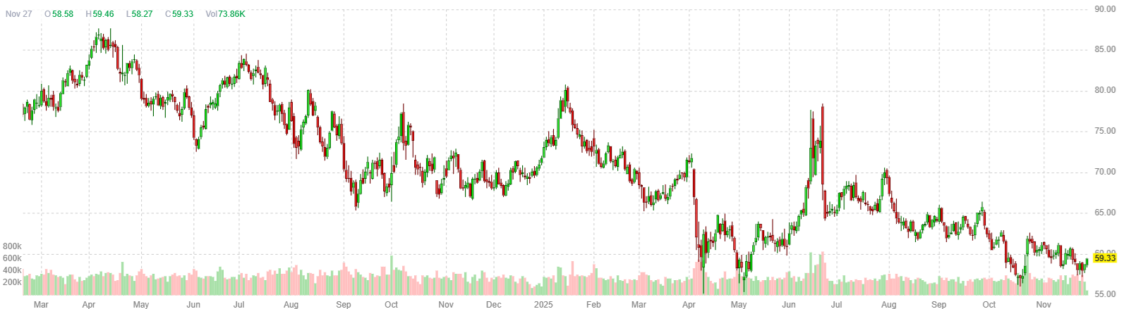 Оба контракта направляются к четвёртому месячному снижению подряд — это самая продолжительная полоса потерь с 2023 года, поскольку ожидания роста мирового предложения продолжают оказывать давление на цены, несмотря на рост около 1% за неделю.