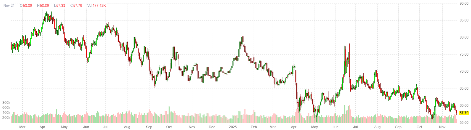 Американская нефть West Texas Intermediate подешевела на 2,05%, до $57,79.