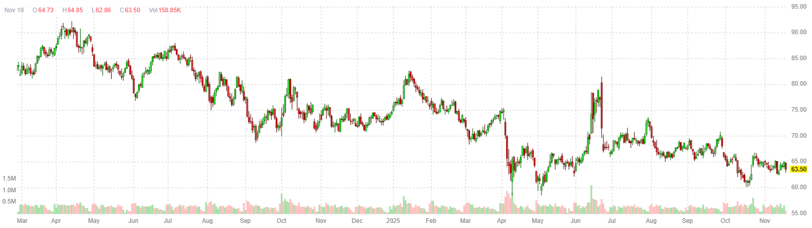 На момент подготовки материала фьючерсы на нефть марки Brent подешевели на 2,1%, до $63,50 за баррель, после роста на 1,1% в предыдущую сессию.