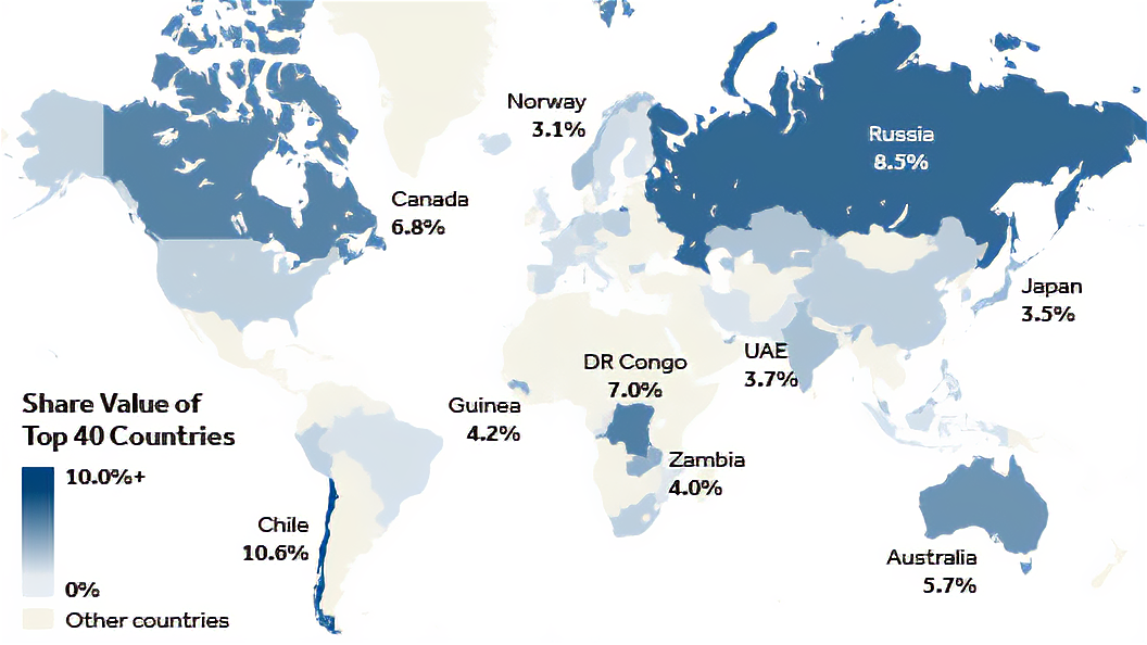 В банке изучили более 30 млн торговых коридоров между странами и обнаружили, что цепочки поставок минералов, связанных с ИИ, невероятно сконцентрированы: 40% импорта таких минералов приходится на трёх или менее торговых партнёров по каждому продукту.