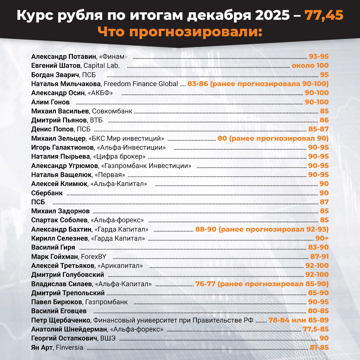 И только три из них оказались верны. Старший трейдер компании «Альфа-Капитал» Владислав Силаев предположил в ноябре, что к концу года курс составит 76-77 рублей за доллар. Руководитель департамента компании «Альфа-форекс» Анатолий Шнейдерман прогнозировал 77,5-85 рублей за доллар. Петр Щербаченко из Финансового университета при Правительстве РФ называл в одном из сценариев 78-84 рубля за доллар.