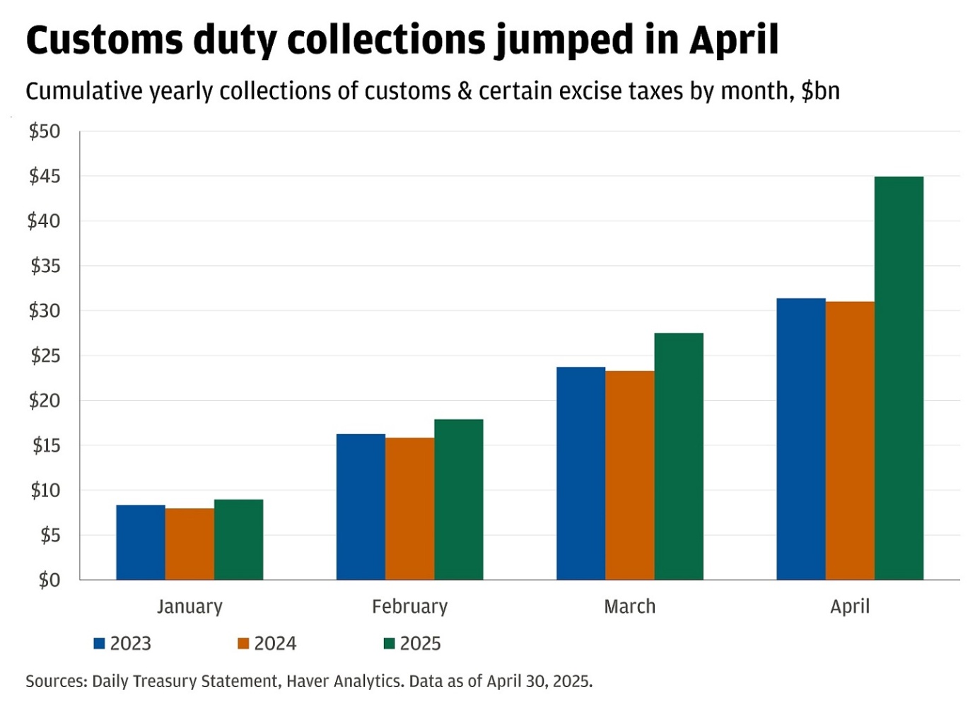 Предполагаемый эффективный уровень тарифов в США вырос до самого высокого уровня за 100 лет. Это привело к тому, что бизнес принял упреждающие меры, увеличив импорт сырья в 1-м квартале этого года, чтобы успеть до вступления в силу новых тарифов. В 1-м квартале 2025 года импорт в США вырос, и в результате поступления в бюджет от таможенных и некоторых акцизных сборов в апреле увеличились более чем на 60% по сравнению с мартом этого года.