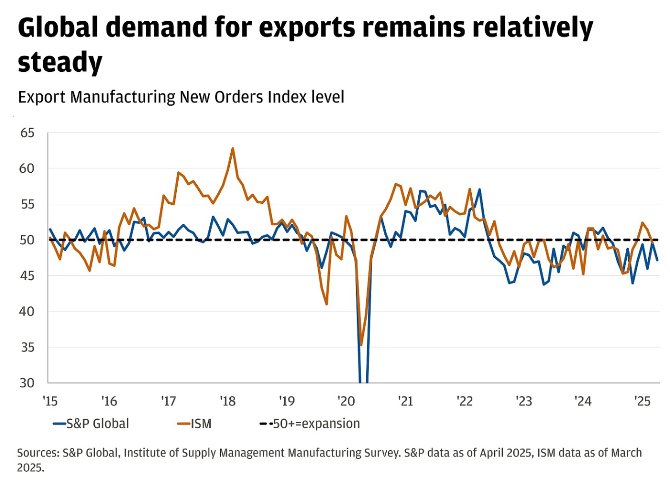 Реальный ВВП США в 1-м квартале 2025 годам снизился на 0,3%. Важным уточнением к основному показателю стало искажение базовых данных из-за того, что чистый экспорт отнял 4,8 процентных пунктов от основного показателя, что является самым большим снижением за всю историю. В JPM настаивают, что лучшим показателем роста экономики является внутренний спрос и благодаря ему ВВП прибавил 2,5 процентных пункта, что соответствует динамике ВВП в 4-м квартале 2024 года.