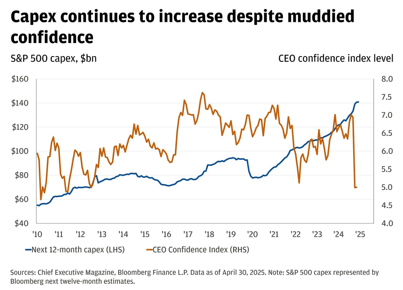 Настроения подавлены не только на Уолл-стрит, но и среди руководителей корпораций. Опрос, который измеряет ожидания руководителей корпораций в отношении общих условий ведения бизнеса через год, показал самый низкий уровень с 2011 года. Можно было бы ожидать, что падение доверия руководителей корпораций повлияет на планы корпоративных расходов (на найм сотрудников, инвестиции или расширение производства).