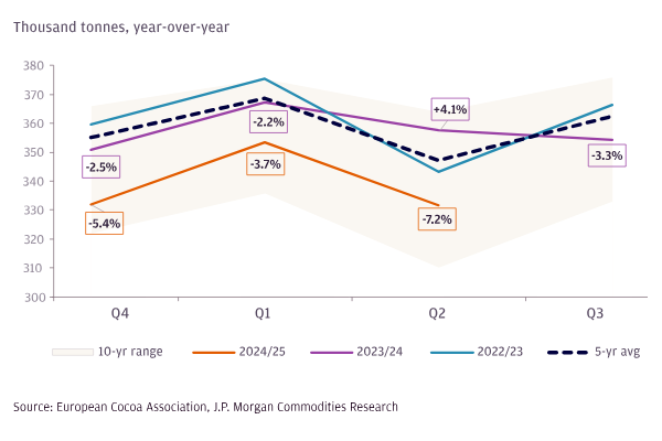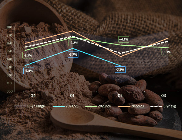 Линейный график, отражающий объёмы переработки какао в Европе, которые во втором квартале 2025 года сократились на 7,2 % по сравнению с аналогичным периодом прошлого года.
