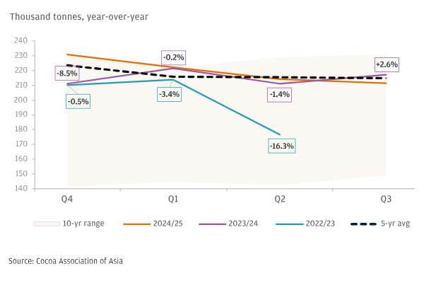 Линейный график, отражающий объёмы переработки какао в Азии, которые во 2-м квартале 2025 года снизились на 2,8% по сравнению с аналогичным периодом прошлого года.