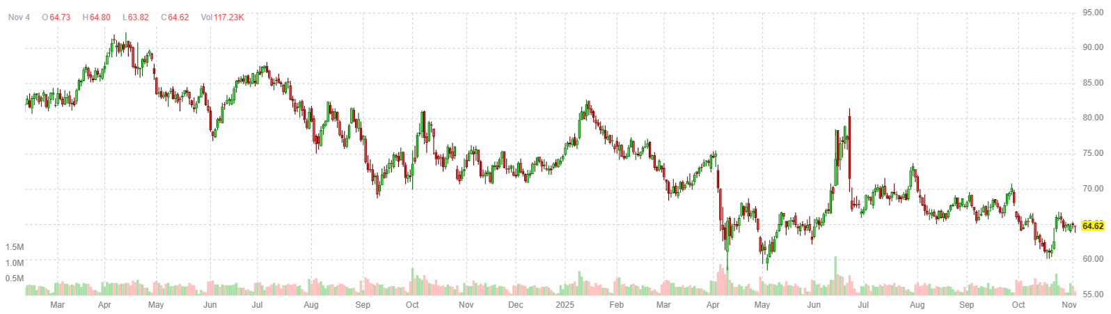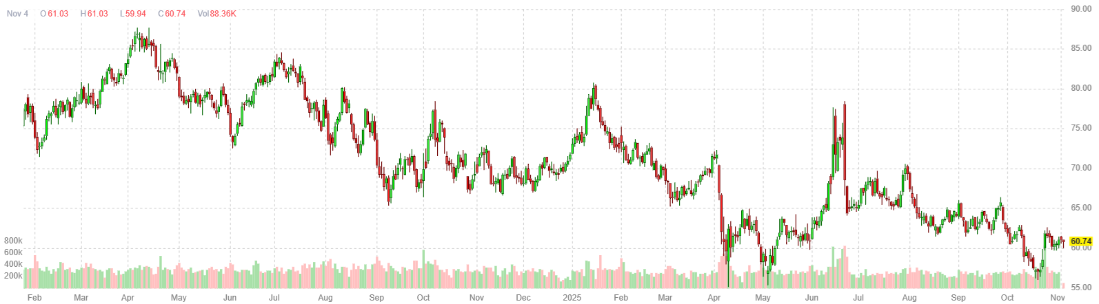 С начала года WTI потеряла 16%, поскольку страны ОПЕК+ и производители вне альянса нарастили добычу. Цены временно восстановились после объявления США о санкциях против «Роснефти» и «Лукойла», но затем снова пошли вниз. По данным Bloomberg, морские поставки российской нефти резко сократились, особенно по объёму разгрузки, тогда как объём нефти «на воде» вырос.