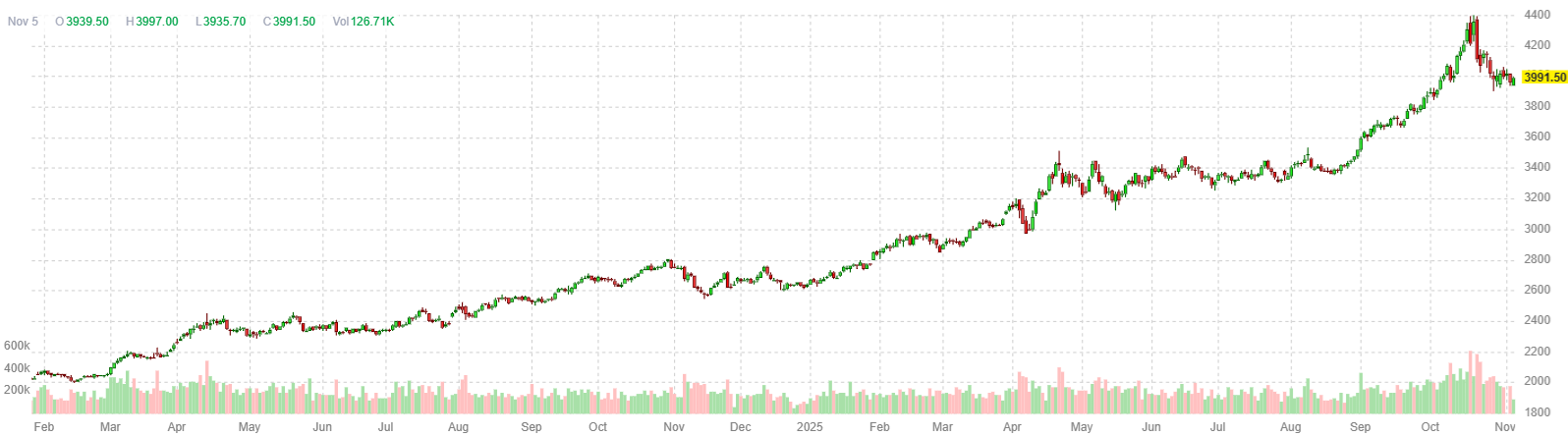 На момент подготовки материала спот-цена на золото поднялась на 1,2% — до $3 977,55 за унцию, декабрьские фьючерсы — на 0,8%, до $3 991,50.