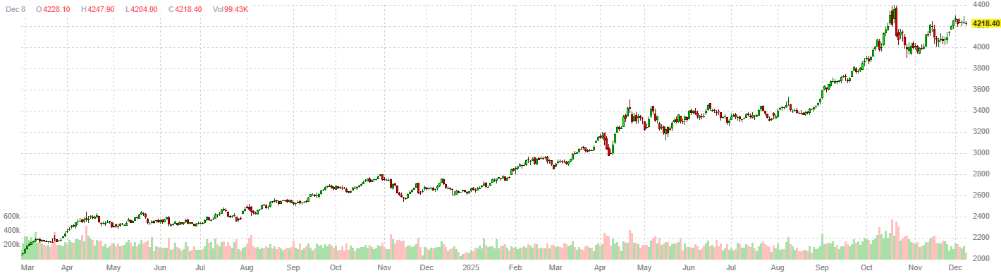 На момент подготовки материала спотовая цена золота снизилась на 0,12% до $4 191,30 за унцию, тогда как февральские фьючерсы в США опустились на 0,58% до $4 218,40 за унцию.
