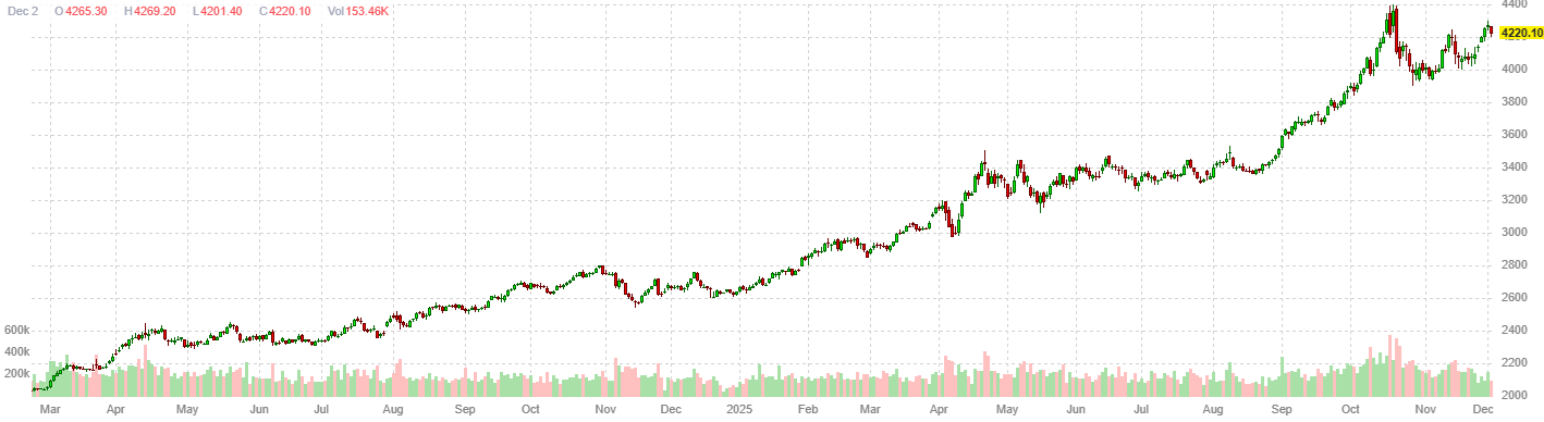 На момент подготовки материала спот‑цена золота упала на 1,36%, до $4 174,99 за унцию. Фьючерсы на золото с поставкой в феврале снизились на 1,28%, до $4 220,10 за унцию.
