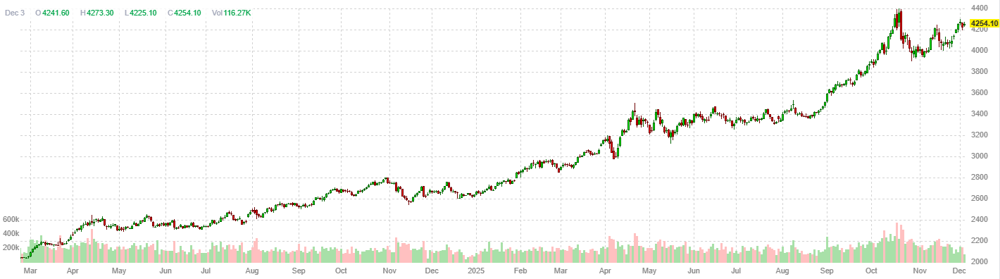 На момент подготовки материала спот‑цена на золото прибавляла 0,35% и торговалась по $4 221,71 за унцию, после падения более чем на 1% в предыдущей сессии. Фьючерсы на золото с поставкой в декабре росли на 0,79% до $4 254,10 за унцию.