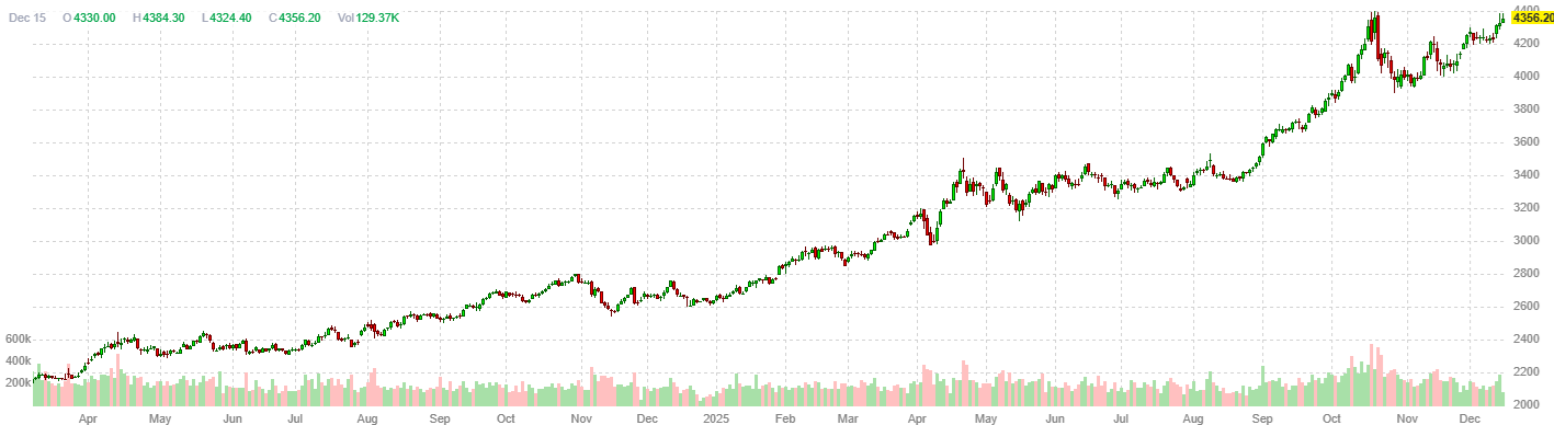 На момент подготовки материала спот‑цена золота выросла на 0,52% — до $4 324,65 за унцию, после роста более чем на 1% в ходе сессии. В пятницу котировки достигли максимума с 21 октября. Фьючерсы на золото в США поднялись на 0,64% — до $4 356,20 за унцию.
