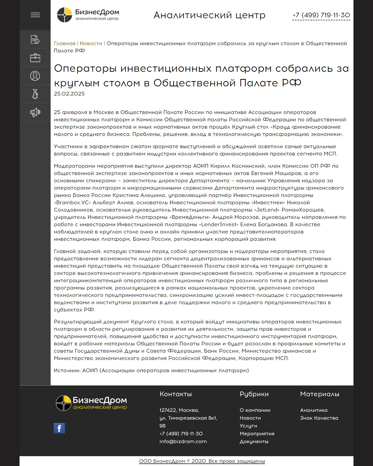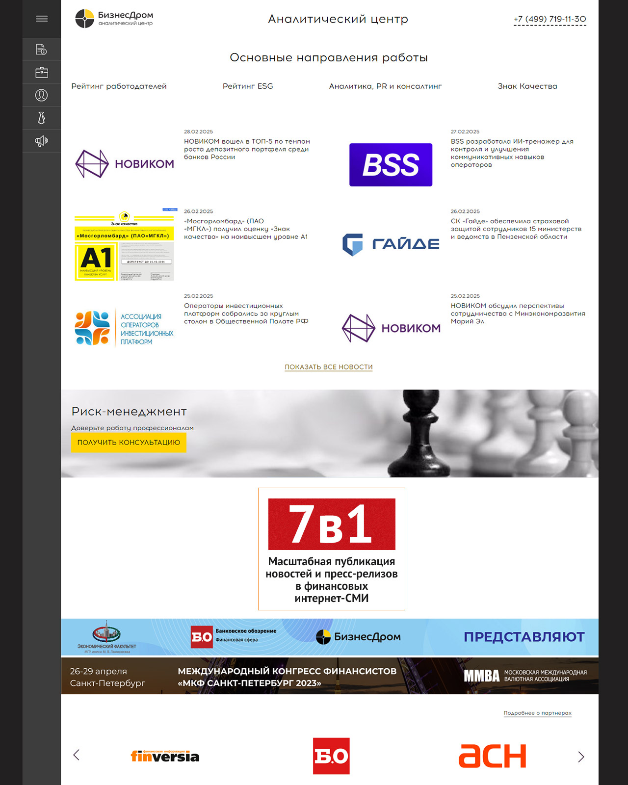 Сайт аналитического центра «БизнесДром» – специализируется на теме финансовых рынков – банковского, инвестиционного, страхового, микрофинансового, а также на теме развития малого и среднего бизнеса. На сайте и telegram каналах «БизнесДром» публикуются экспертные колонки, интервью участников финансового рынка, информация об отраслевых конференциях, форумах и премиях. Аудитория: представители компаний-участников финансового рынка, профессиональных объединений и ассоциаций.
