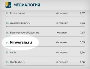В сравнении с рейтингом Медиалогии по итогам 2020 года, Finversia поднялась с 17-го на 14-е место. Рейтинг рассчитан на основе базы СМИ системы «Медиалогия», включающей более 61 тыс. наиболее влиятельных источников: ТВ, радио, газеты, журналы, информационные агентства, Интернет-СМИ.