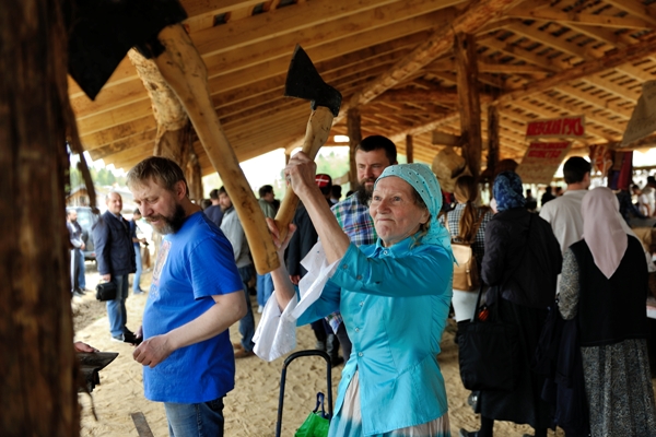 Мы осматриваем торговый павильон. Первым делом бросается в глаза большая книга «От Адама до Путина. Учебник истории. Все 75 веков истории человечества. Том 2. От Македонского до Мономаха». Рядом в упаковках «Иван-Чай», другие травы. Берестяные изделия, горшки разнообразной формы и функциональности. Квашенные весенние дикоросы (приправа для супа). Масло, сметана. Далее – столярная мастерская с мастер-классом. Мёд. Сидр. Крестьянское пиво и вино из Кубани. Рядом с этими прилавками, понятное дело, особенное оживление. Изделия из воска. Натуральная косметика, мыло. Недалеко дают мастер-класс по мыловарению и выпариванию берёзового дёгтя, работе на гончарном круге и изготовлению стеклянных бусин. За оградой – мастер-класс по правилам верховой езды, в версте от торговой площади - мастер-класс по основам натурального пчеловодства. На метание ножей от сыновей Пантелеймона и Михея Стерлиговых мы не попадаем.