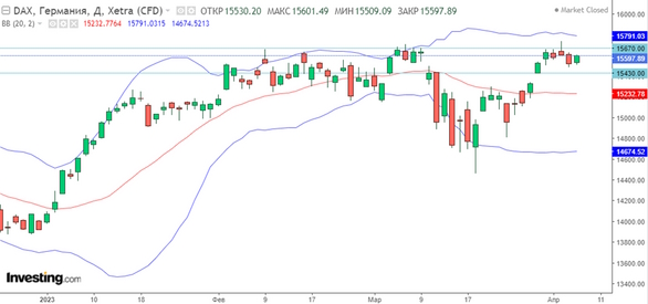 На дневном графике DAX продолжает консолидацию под сопротивлением на 15 670, в случае пробития которого индекс может продолжить рост до диапазона 15 800 – 15 850.