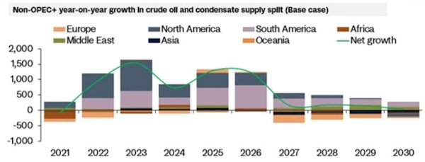 Rystad Energy между тем написал, что в целом для рынка нефти ключевое значение приобретают поставки стран non-OPEC. В базовом сценарии Rystad показывает, что к 2026 г. существенно увеличивается доля Южной Америки в поставках. Между тем, в 2027 г. предложение non-OPEC начинает сокращаться.