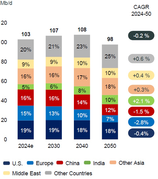 Total Energies между тем 04.11 представил свой обзор рынка энергетики. Касаемо нефти и нефтепродуктов, TE полагает, что спрос на нефть будет увеличиваться до 2040 г. (до уровня 108 mbd), после чего начнётся снижение. Ключевыми регионами, обеспечивающими спрос станет Индия, страны Ближнего Востока и другие страны Азии. В Китае и Европе спрос на нефть, по мнению TE, к 2040 г. сократится.