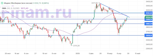 С технической точки зрения индекс МосБиржи вплотную приблизился к границе краткосрочного нисходящего тренда и 50-дневней скользящей средней. В случае пробития данного уровня у индекса откроется дорога к росту до сопротивления у отметки 3 130 пунктов. В то же время ближайшей поддержкой на данный момент выступает уровень в 2 990 пунктов.
