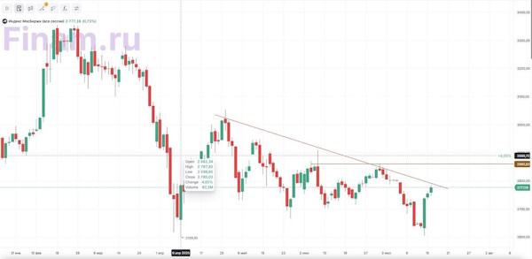 Индекс Мосбиржи на дневном таймфрейме подходит к наклонной линии, которая может выступать сопротивлением в зоне 2 800 п. В случае если цена пробьет наклонную и закрепиться выше, следующей целью может стать уровень сопротивления на 2860 п.