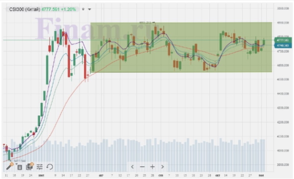 В итоге индекс CSI300 начал торги с приличного гэпа вверх, продолжив затем расти и достаточно быстро достигнув точки локального максимума на отметке 4793,396 п. После чего развернулся в техническую коррекцию, растеряв чуть более трети достижений (привет, Фибоначчи), но снова предпринял попытку подъема, впрочем, уже не такую удачную. В итоге финал торговой сессии оказался на уровне 4777,561 п.