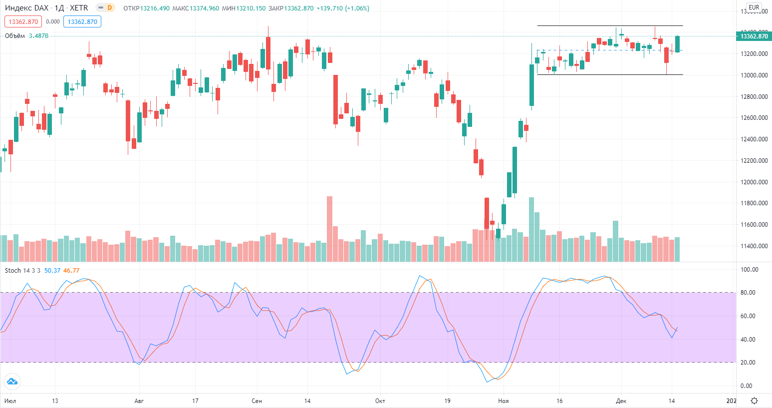 С технической точки зрения индекс продолжает консолидацию в боковом канале. Следующим ключевым уровнем сопротивления выступает отметка 13450, ближайшая поддержка обеспечивается уровнем 13000.