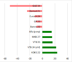 Лидеры ценового роста/снижения в сегменте российских евробондов, б. п.