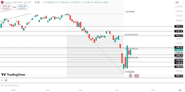 На дневном графике S&P 500 пытается пробить уровень сопротивления 5407 пунктов. При закрытии двух дней выше него возможен рост до уровня 0,618 по линейке Фибоначчи (5650 пунктов).