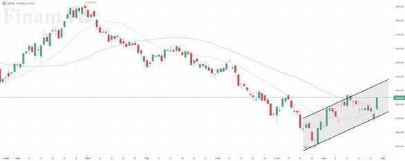 Индекс формирует растущий тренд после выхода из нисходящего коридора. После разворота у нижней границы канала индекс может показать рост до 3900-3950 пунктов.
