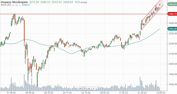 Российский рынок акций продолжил подъем в понедельник, при этом Индекс МосБиржи обновил максимум за год. Поддержку отечественному рынку оказывают сохраняющаяся весьма благоприятная конъюнктура на зарубежных фондовых площадках, которые надеются на скорое завершение нынешнего цикла ужесточения монетарной политики в США, а также высокие цены на нефть, которые удерживаются в районе отметки $86 за баррель марки Brent. Положительный настрой создают и ожидания щедрых дивидендов от ведущих эмитентов. На этой неделе, в частности, по дивидендному вопросу будут голосовать акционеры «Сбера» и «Новатэка». В то же время после существенного роста последних недель рынок выглядит перекупленным, в связи с чем не исключено постепенное нарастание давления продавцов. Поводом для частичной фиксации прибыли, к примеру, могут стать новости относительно прогресса европейцев в деле разработки 11-го пакета антироссийских санкций.